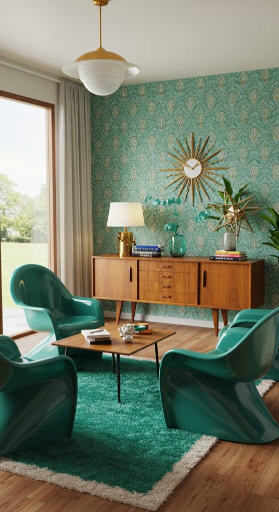 Highlight mid-century modern with vibrant teal colors dominating curved furniture, abstract art walls, and shag rugs.