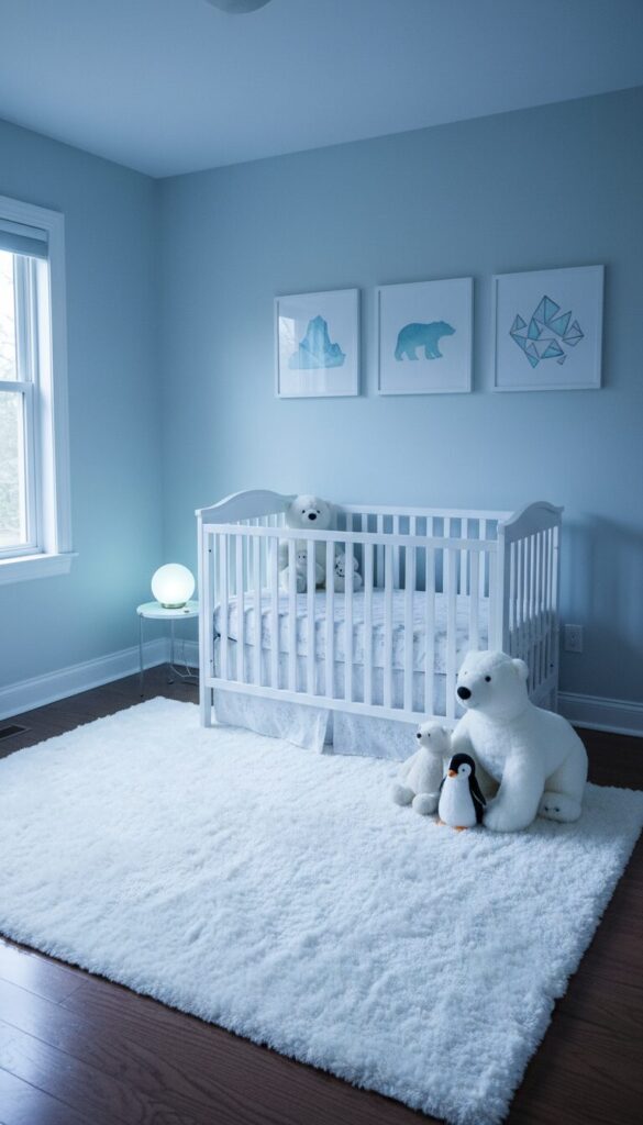 Transform the nursery into a cool and captivating arctic wonderland. This theme features a crisp color palette of icy blues, stark whites, and silvery grays, evoking the serene beauty of the polar regions.