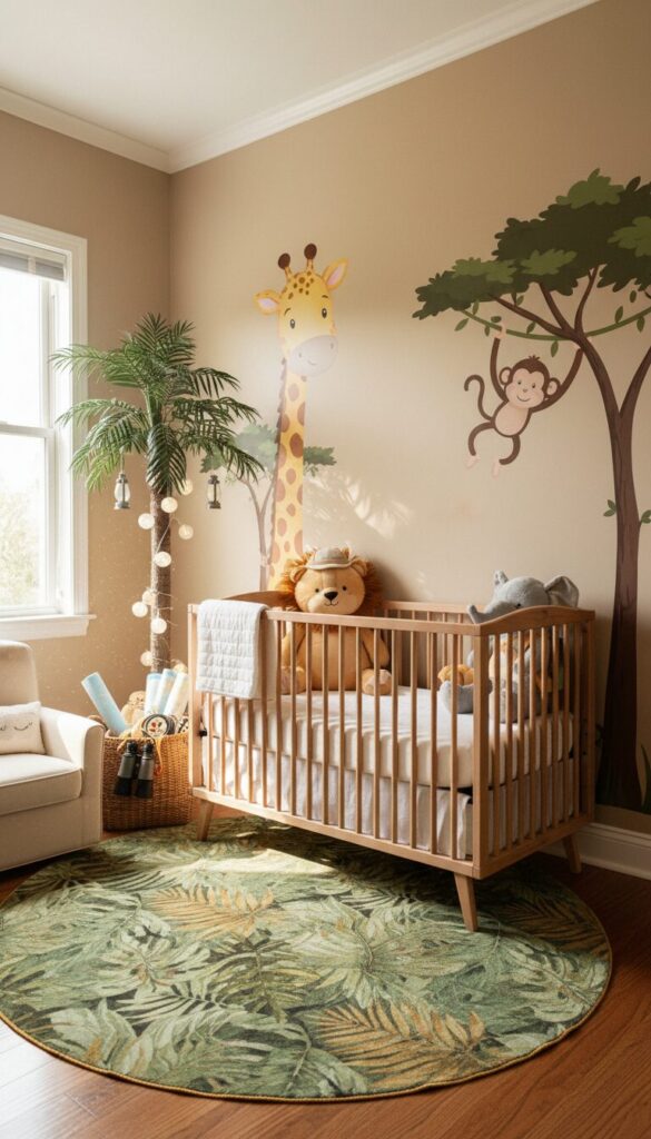 Plush safari animals like lions, elephants, giraffes, and monkeys can be integrated through toys, wall art, and bedding.
