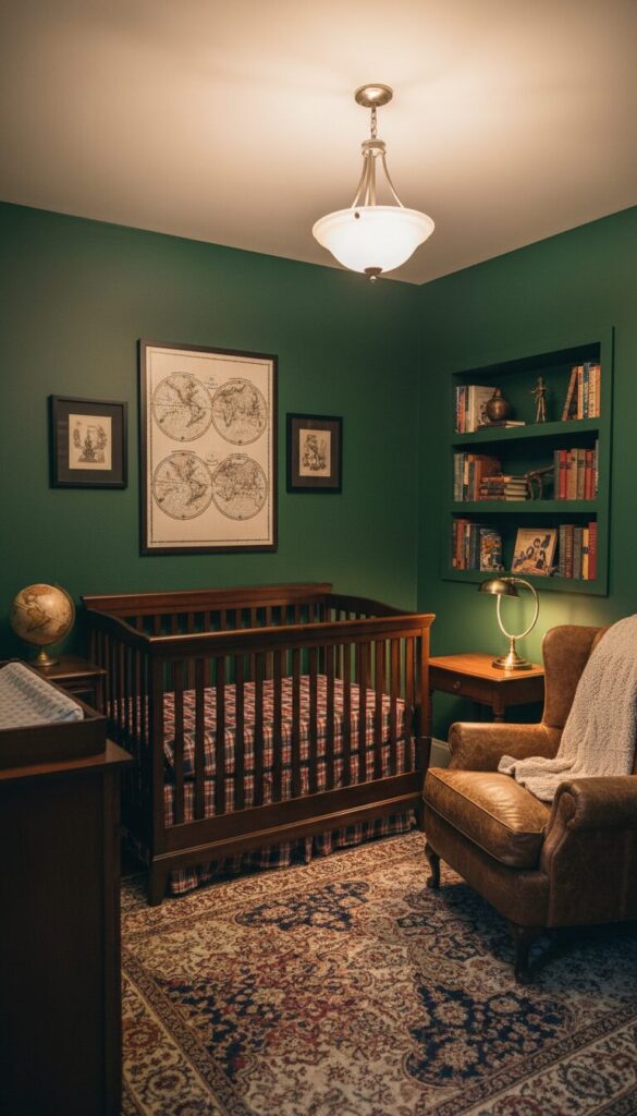 Elements such as classic globes, antique-style books, framed maps, and plaid patterns contribute to a refined atmosphere. It’s a distinguished nursery that feels both cozy and intellectually inspiring.