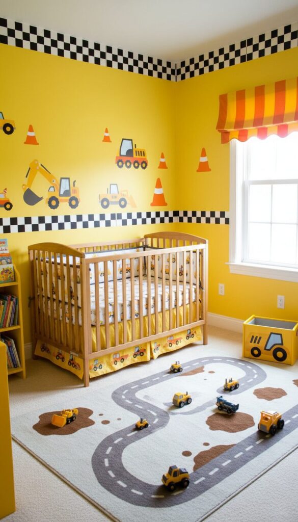 Trucks, bulldozers, cranes, and hard hats become playful motifs, appearing on bedding, wall art, and toy storage.
