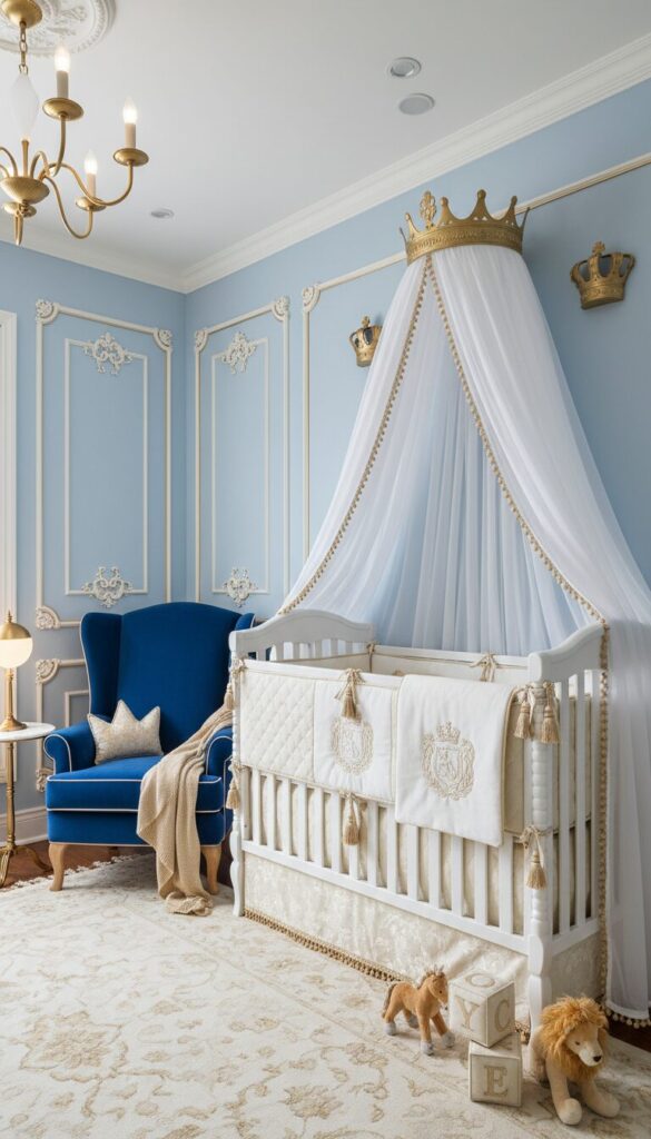 It’s a beautifully adorned nursery fit for royalty, where your little prince can dream big and feel truly cherished.