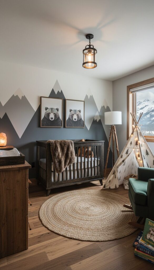 Mountain murals or geometric mountain patterns on the walls can set the scene, while elements like bear motifs or camping-inspired decor add to the charm.