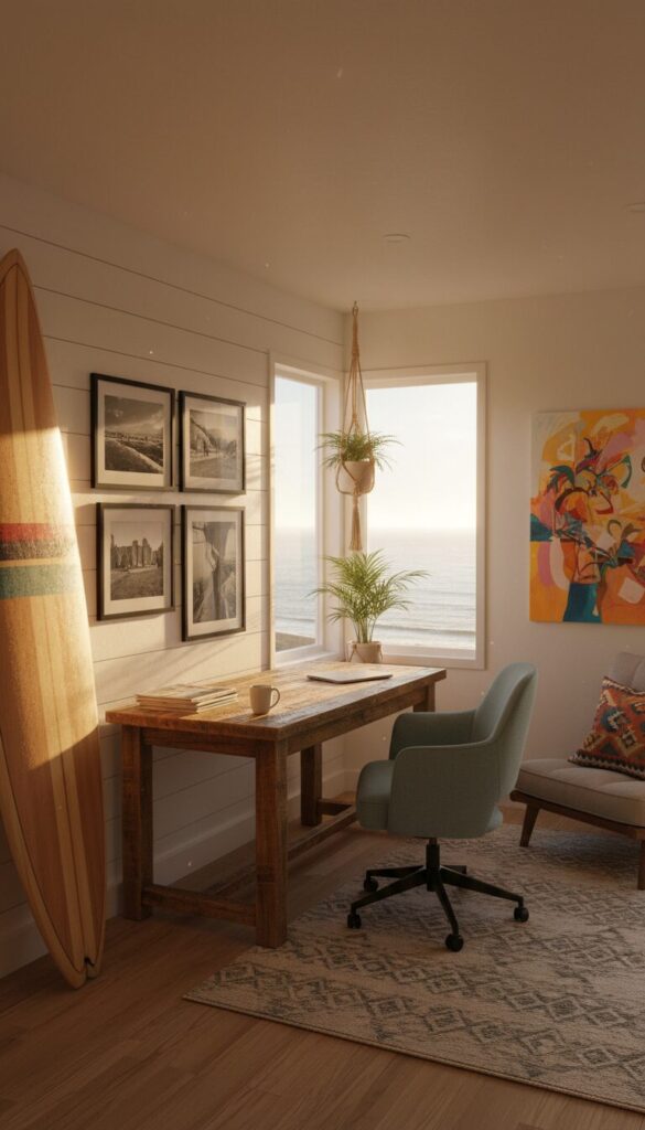 Create a laid-back and cool Surfer’s Sanctuary for your home office, embodying a relaxed, free-spirited vibe.