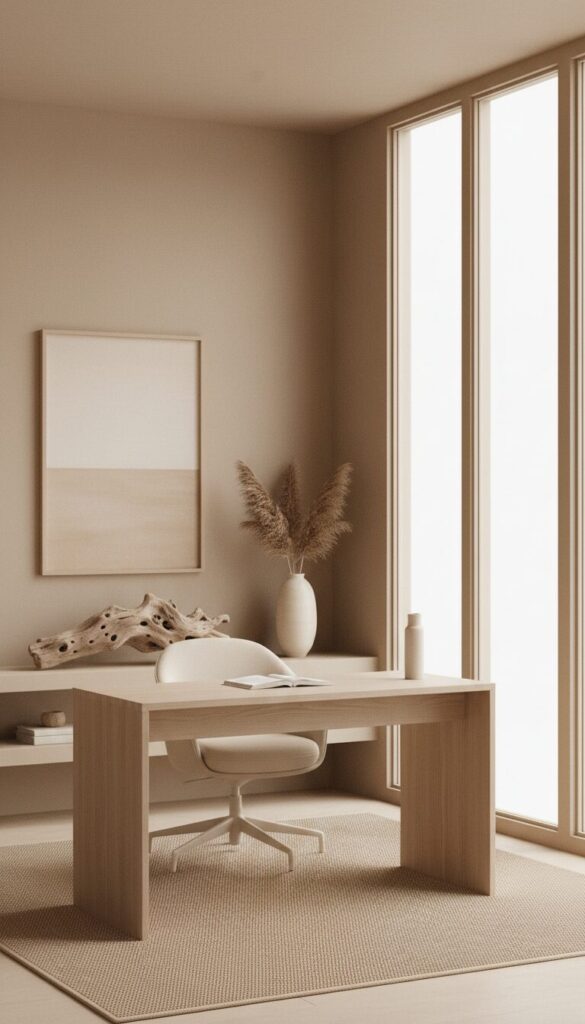 Embrace the tranquil simplicity of a Sandy Shores Palette in your home office. This style focuses on muted sandy tones, creamy whites, and warm beiges, emphasizing natural textures and uncluttered simplicity.