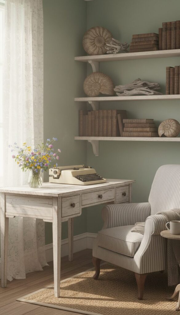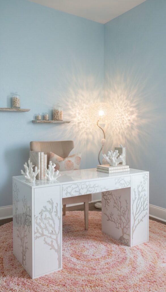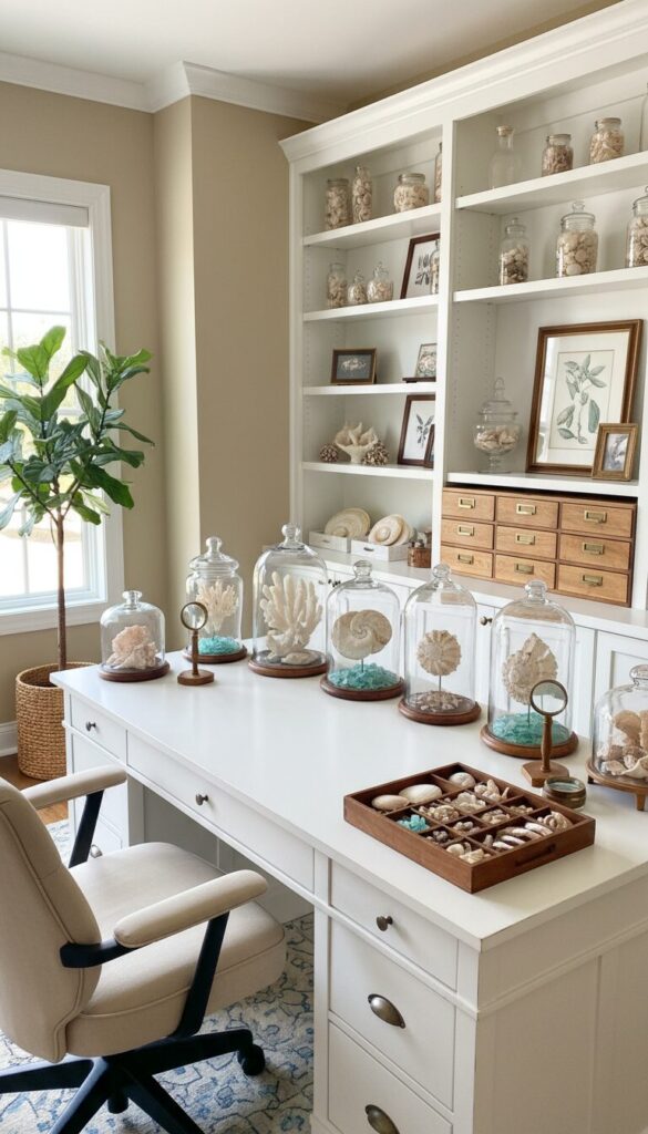 Design a Shell Collector’s Haven, a meticulously curated office that celebrates the intricate beauty of seashells, sea glass, and coral.