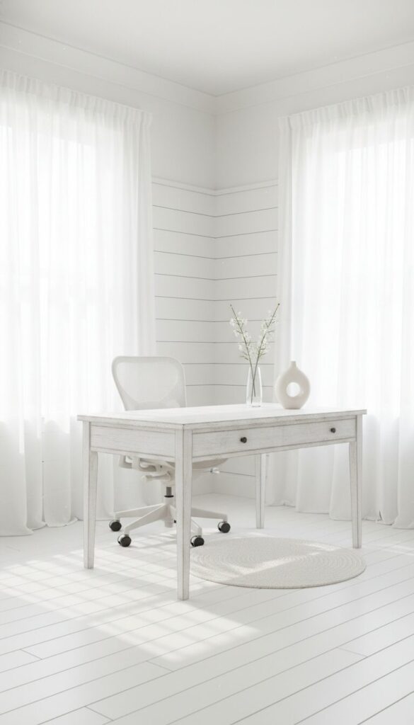 Step into an incredibly bright and airy workspace with the Whitewashed Wonders aesthetic. This style relies on an all-white or off-white palette, layered with subtle textures to prevent it from feeling stark.