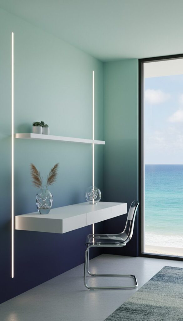 This style pairs these captivating colors with crisp whites or neutrals to prevent overwhelming the space. Think subtle ombre effects on walls, glass decor resembling water, and art inspired by underwater landscapes.