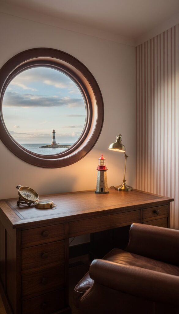 Rich wooden furniture and framed maps can add an authentic touch, creating a sophisticated and adventurous workspace that echoes the spirit of the open sea.