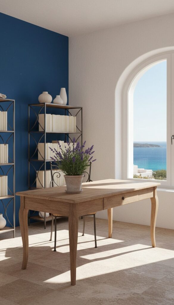 Evoke the serene beauty of the Mediterranean coast with this elegant office style. It combines crisp whites, deep blues (like cerulean or azure), and earthy tones of terracotta and olive green.