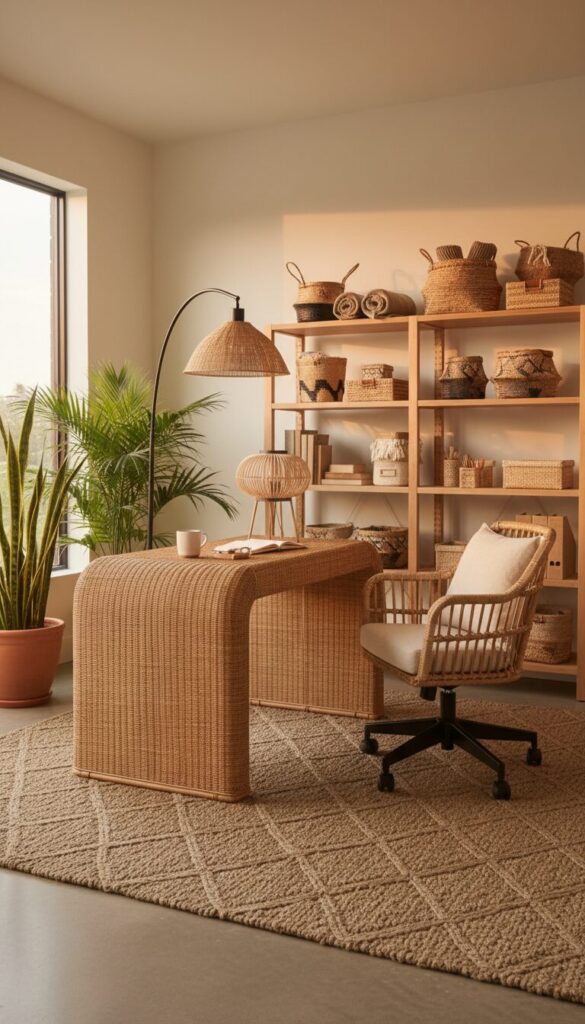 This style highlights furniture and decor made from rattan, seagrass, and jute, bringing an organic, tactile warmth to the office.