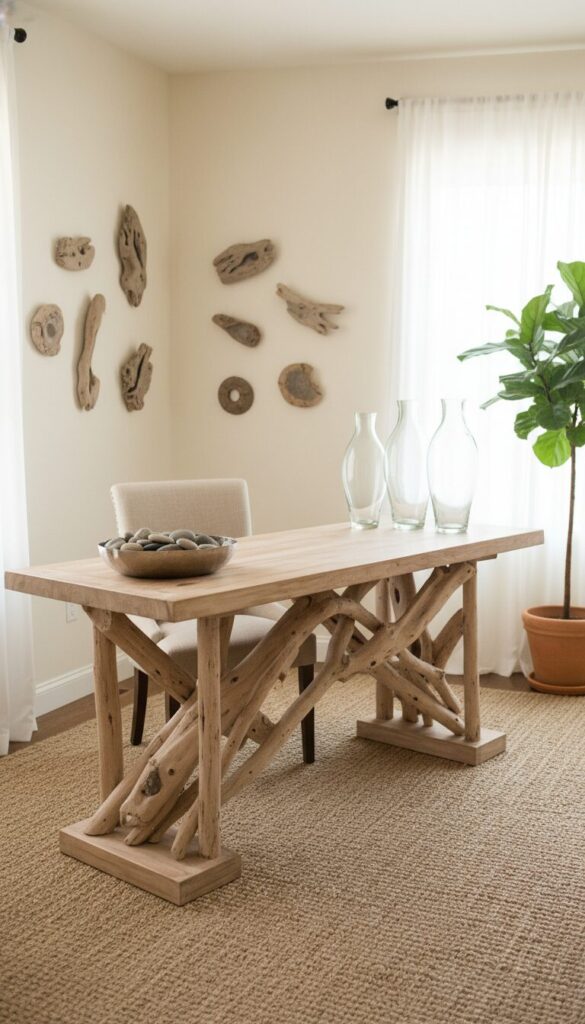 This style integrates actual driftwood pieces, reclaimed wood furniture, and a palette of grays, whites, and sandy beiges.