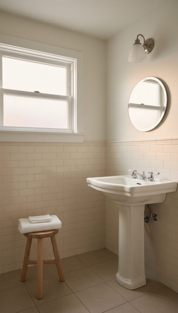 Infuse your bathroom with rustic farmhouse charm by combining beige tiles with natural wood elements and vintage-inspired fixtures.