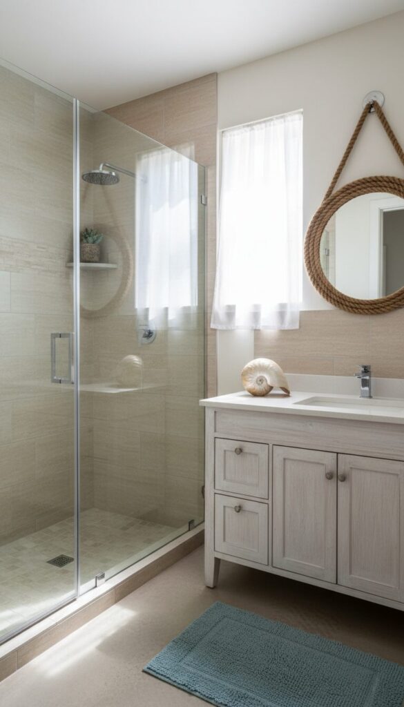 Bring the calming essence of the coast into your bathroom with a beige tile foundation. Pair sandy beige tiles with crisp white elements, light wood tones, and hints of sea-inspired blues or greens.