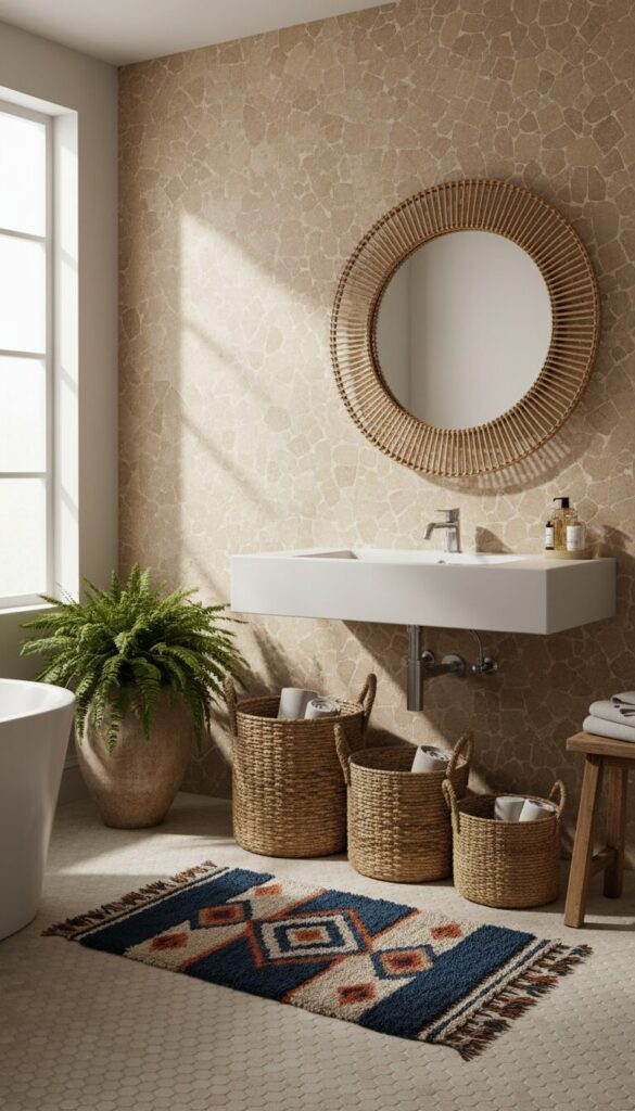 Infuse your bathroom with bohemian flair using beige tiles as a grounding element. Combine textured beige wall tiles, perhaps with a zellige-inspired finish, with natural materials like rattan, woven baskets, and macramé accents.