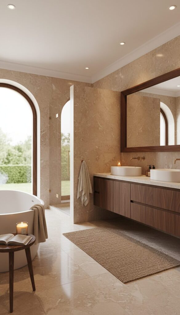 This combination adds depth and organic texture, transforming the bathroom into a serene escape reminiscent of a high-end spa. Consider using a mix of light beige and medium-toned wood for a balanced, harmonious look.