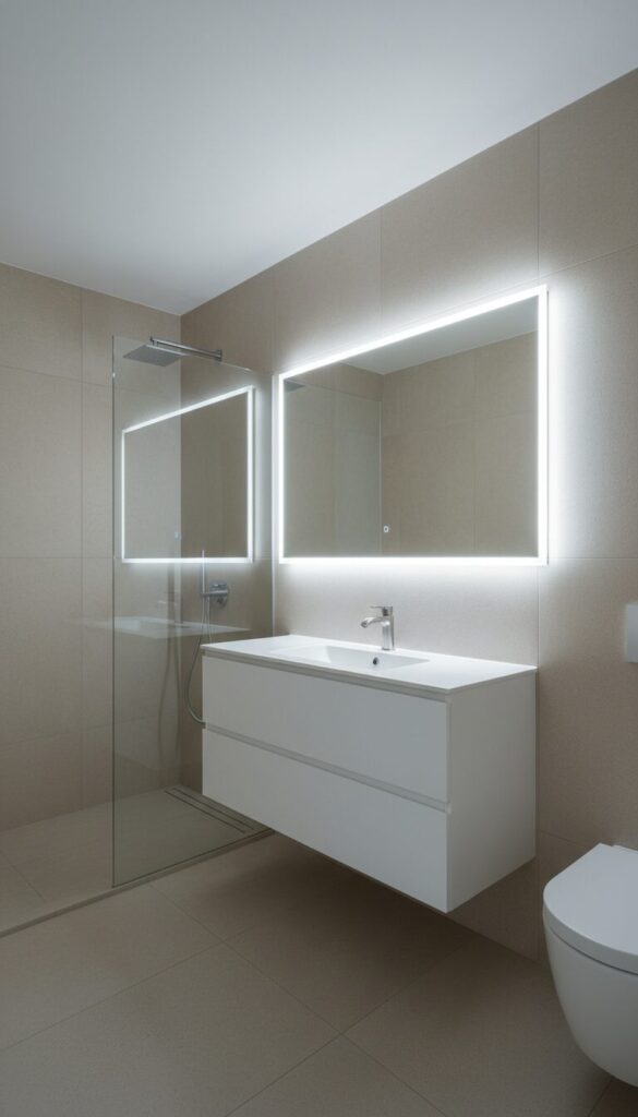Create an illusion of spaciousness and an incredibly clean look with large format beige tiles. Fewer grout lines mean less visual interruption and easier maintenance, making the bathroom feel more expansive and seamless.