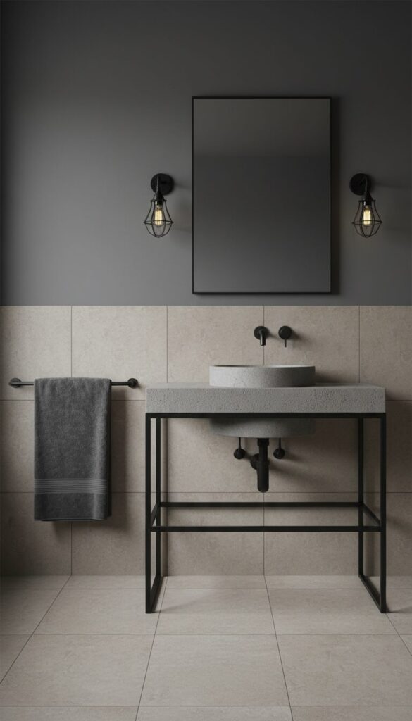 Utilize matte beige tiles, perhaps with a concrete-like finish, on the floor and lower walls. Introduce elements like exposed piping, black metal fixtures, and a concrete or dark wood vanity.