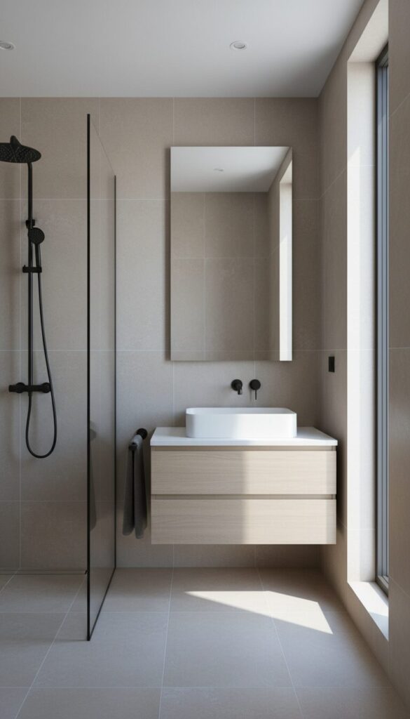 For a bold, contemporary statement, pair neutral beige tiles with striking dark fixtures. Matte black faucets, showerheads, towel rails, and even vanity hardware create a crisp, modern contrast against the warm beige backdrop. This high-contrast approach adds a sophisticated edge and a touch of drama to the space.