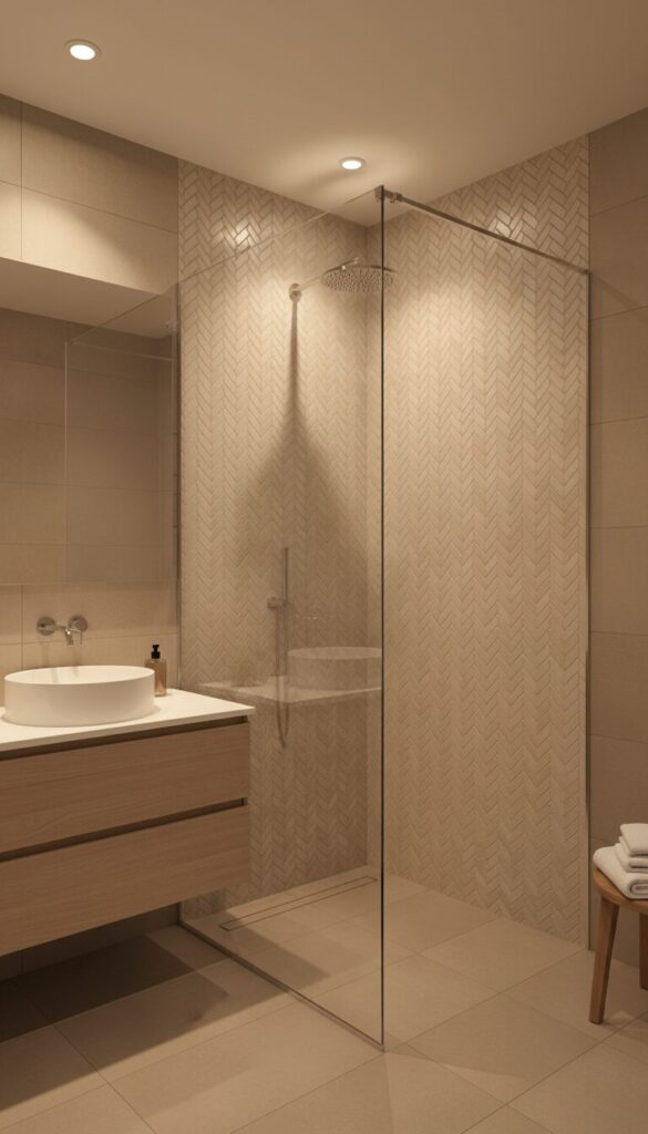 Introduce a touch of sophisticated detail with a herringbone pattern using beige tiles. This elegant layout can be applied to a single accent wall, within the shower enclosure, or even on the floor to draw the eye and add textural interest.