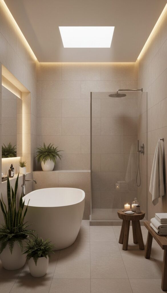 Design a tranquil spa-like sanctuary using a harmonious blend of beige tiles and soothing elements. Opt for matte finish beige porcelain tiles on both walls and floor to create a seamless, calming envelope.