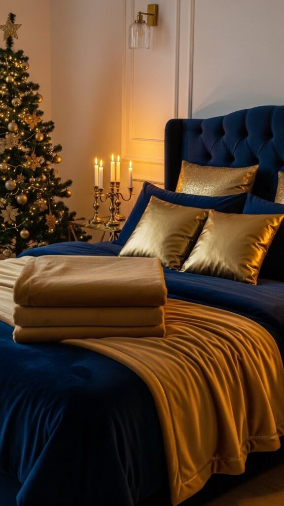 - Navy and gold combinations create luxurious, elegant Christmas bedrooms with warm metallic accents
