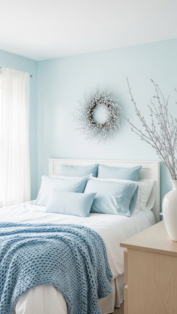 The color palette stays soft and muted—think frozen lakes and winter skies just before dawn. A chunky knit throw in powder blue drapes casually across the foot of the bed, inviting you to curl up with hot cocoa.