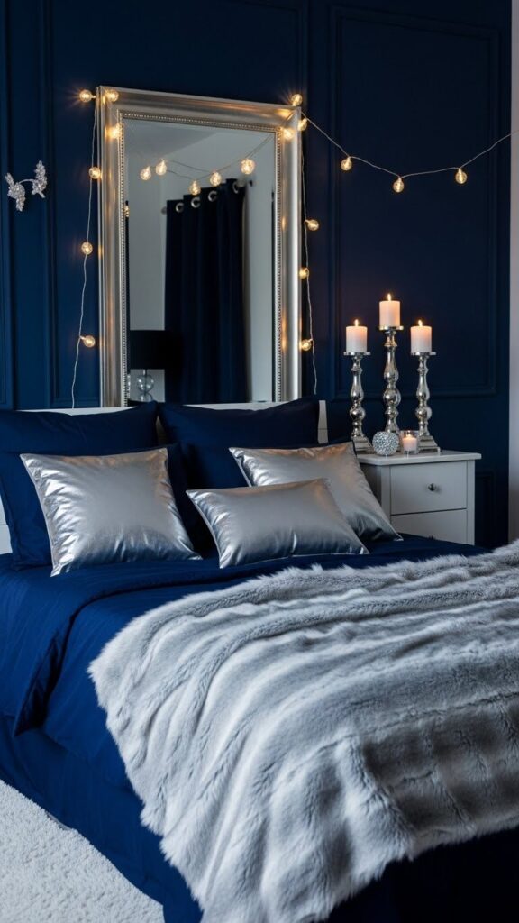 String lights weave along the headboard, their warm glow softening the boldness of the deep blue. Silver accents—ornaments, picture frames, and candle holders—add a festive shimmer without competing with the richness of the velvet.