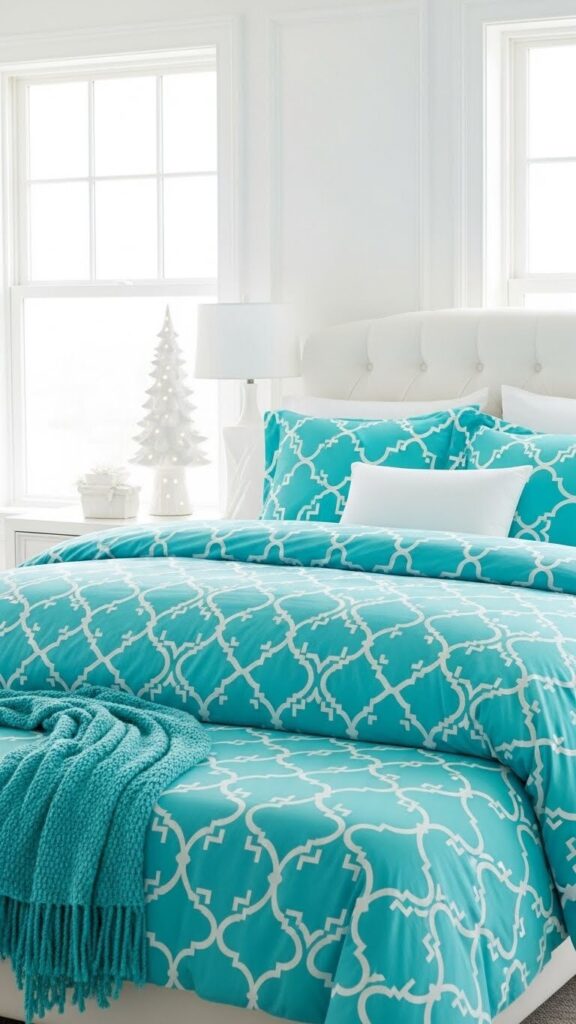 Bright turquoise bedding against crisp white walls creates an energizing space that still feels restful and clean. The bold blue-green adds personality without overwhelming the room’s peaceful atmosphere.