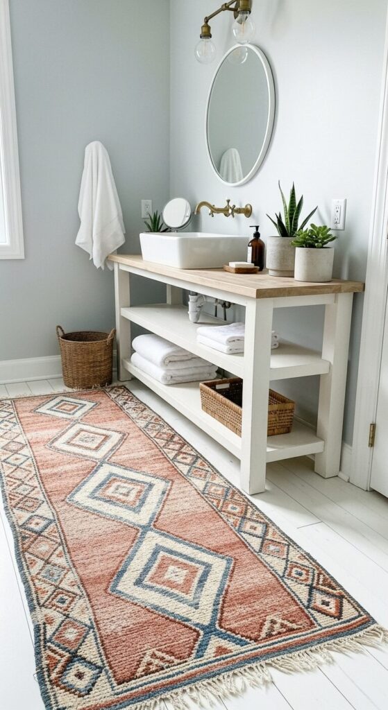 A vintage Moroccan runner tells a story with every weathered pattern and sun-bleached hue. Picture soft terracottas, dusty blues, and cream tones that look like they’ve traveled through time, creating an instant focal point in your bathroom.