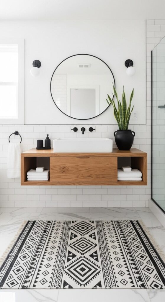 Round rugs are perfect for centering under a freestanding tub or defining space in front of a vanity. They break up the predictable rectangular patterns that dominate bathroom design.