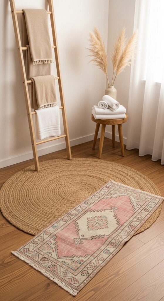 Layering also allows you to experiment without commitment. Swap out the top rug seasonally or whenever you want a quick refresh, keeping your bathroom feeling dynamic.