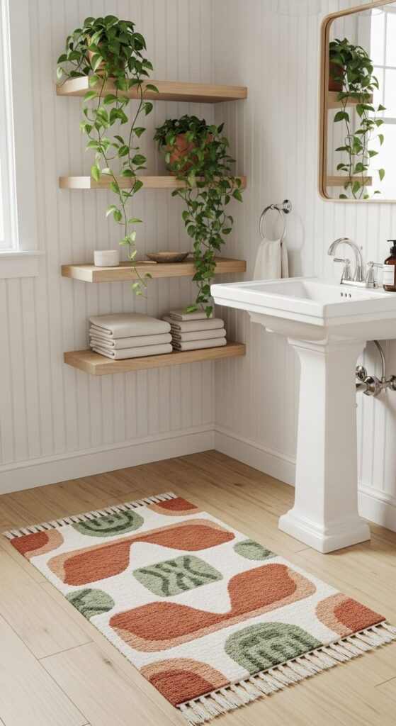 Imagine a rug that combines terracotta warmth with sage green freshness—it’s like bringing the desert and the garden together. This color combination feels organic, grounded, and incredibly soothing in bathroom spaces.