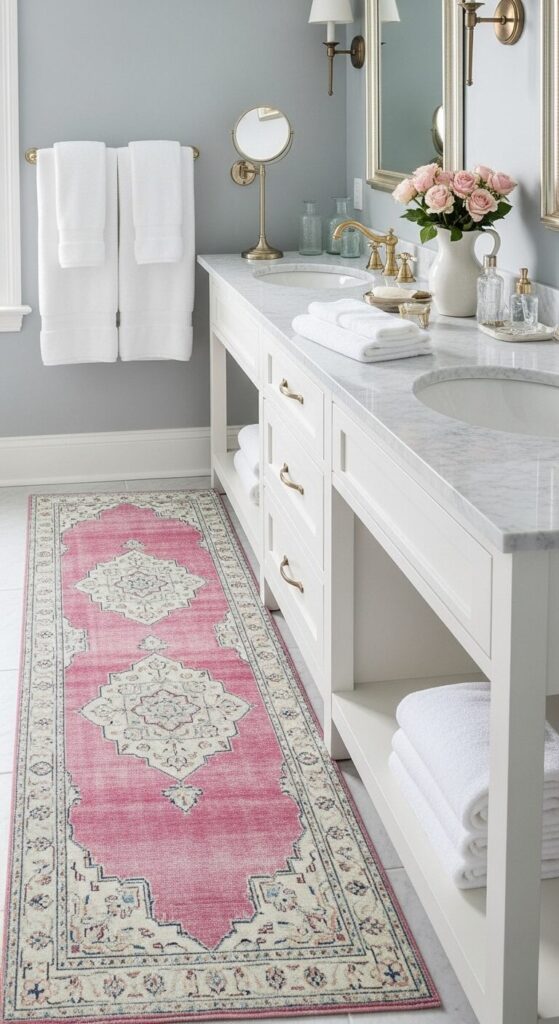 A faded pink Persian-inspired runner brings vintage elegance with its intricate medallion patterns and blush tones. The weathered appearance creates instant character, making your bathroom feel like a treasured, collected space.