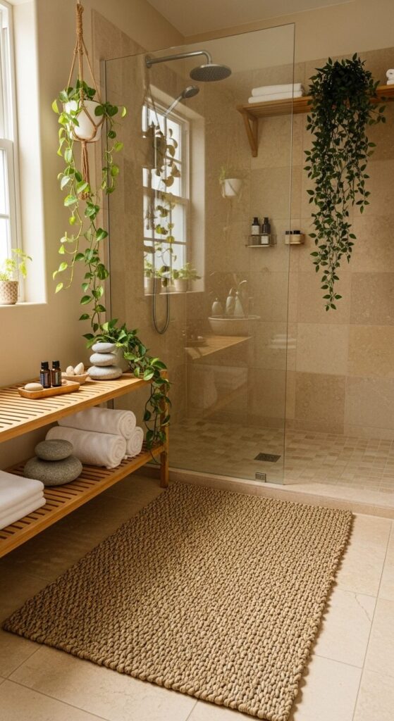 This style works beautifully in bathrooms with white or cream walls, creating an earthy foundation that grounds your space. The natural weave brings organic texture that pairs perfectly with wooden accents and greenery.