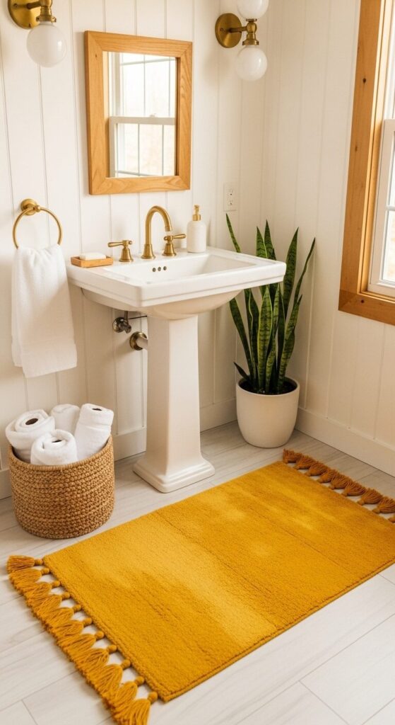 Recreate the Vibe: Use your mustard rug as the jumping-off point for your color scheme. Add coordinating elements like ochre-toned towels, brass fixtures, and warm wood tones while keeping the majority of the space neutral to let the yellow shine.