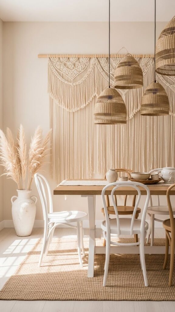 Imagine walls dressed in flowing macramé art that catches afternoon light like woven clouds. The palette stays soft—creams, whites, and sandy beiges—while natural wood brings warmth underfoot and overhead.