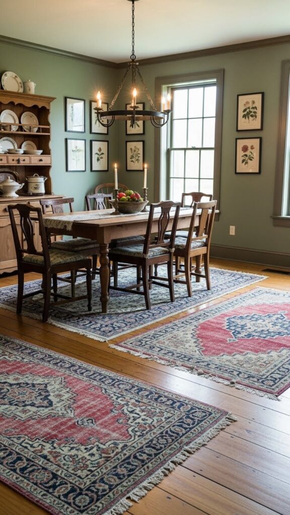 Layer a smaller third rug near the head of the table if space allows. Visit estate sales, rug markets, or online vintage shops for authentic pieces with character.