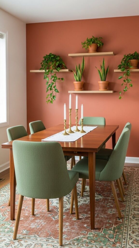 Recreate the Vibe: Paint an accent wall in terracotta or use removable wallpaper if you’re renting. Bring in sage through chair cushions, napkins, or a table runner.