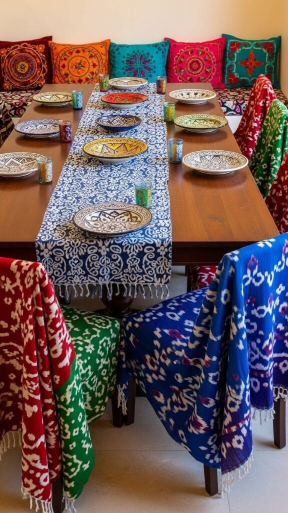 Global textiles bring the world to your table—literally. Think Moroccan wedding blankets, Indian block prints, Turkish suzanis, and Mexican embroidered runners all playing together beautifully.