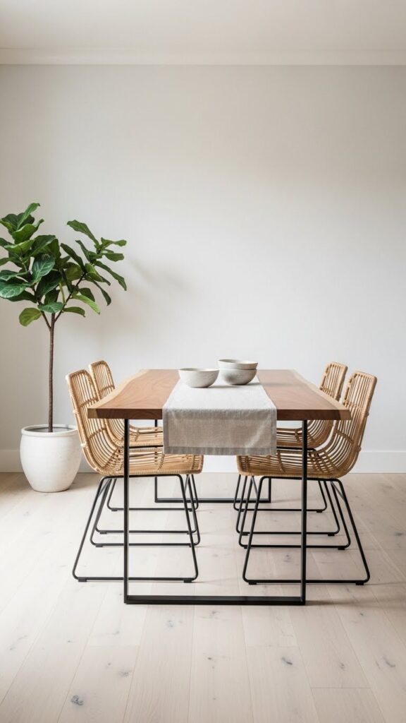 Rattan furniture instantly transports your dining room to a breezy coastal villa. The honey-toned weave catches light beautifully, creating shadows and depth that solid furniture simply can’t match.