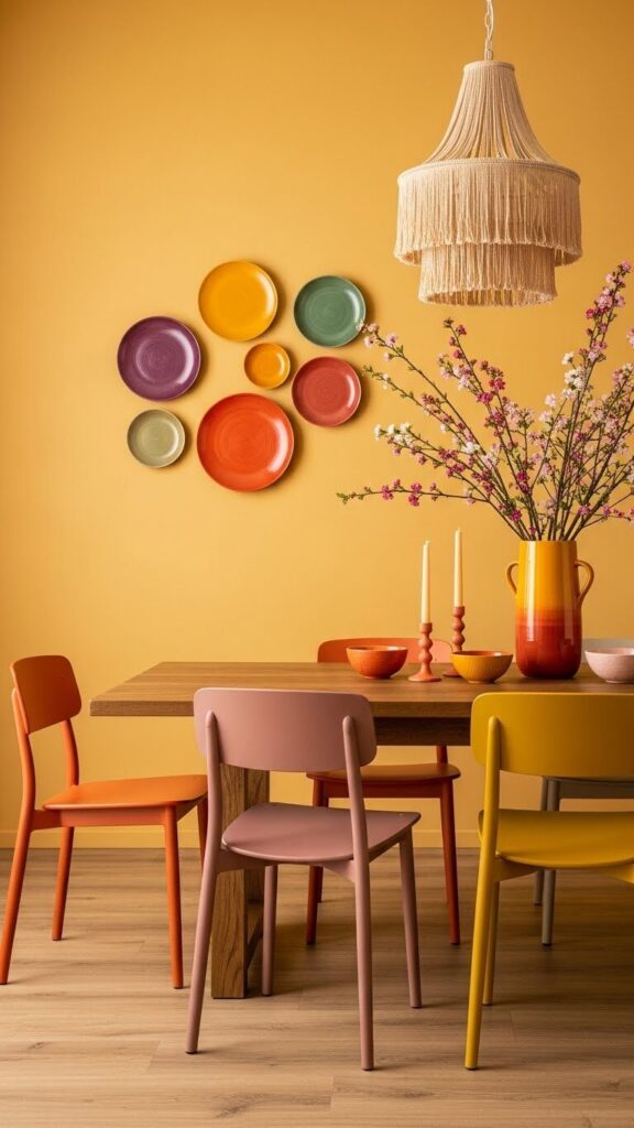 Create a plate wall with colorful ceramics from artisan makers. Add textiles in complementary warm tones. Balance the color with natural wood and plenty of plants to keep it from feeling overwhelming.