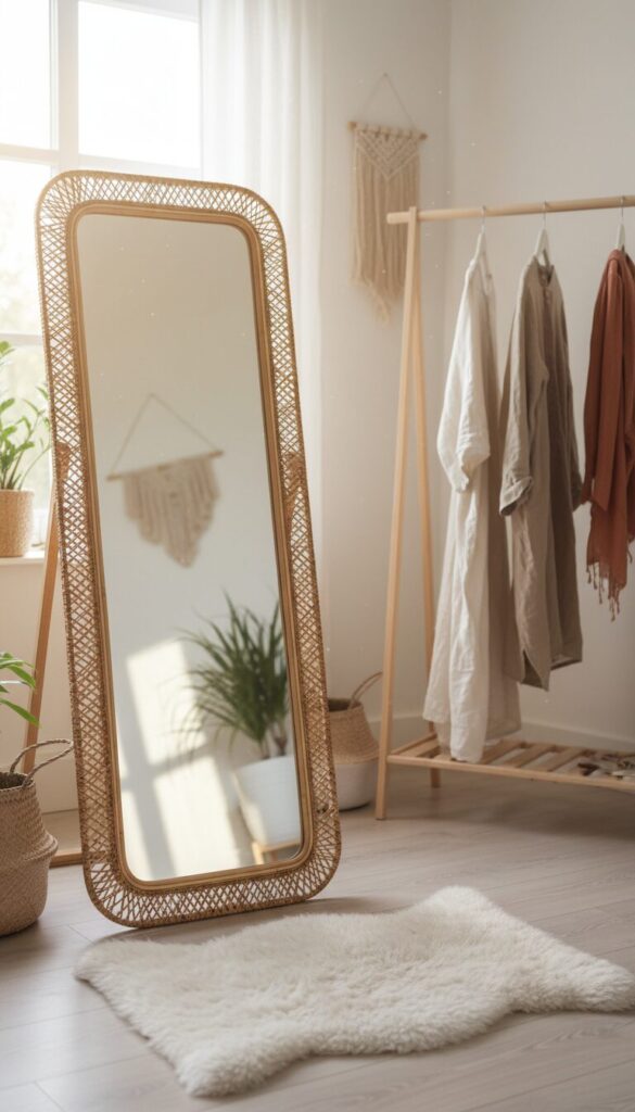 For a grander statement, opt for a full-length mirror with an integrated woven stand, often crafted from rattan, bamboo, or even sturdy jute rope.