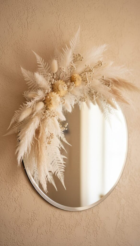 Embrace the delicate beauty of nature by decorating your mirror with dried flowers, pampas grass, or other preserved botanicals.
