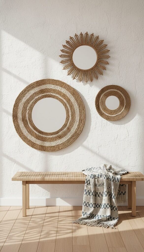Often featuring natural cotton rope in ivory or beige, these mirrors soften hard lines and introduce a tactile dimension to your walls.