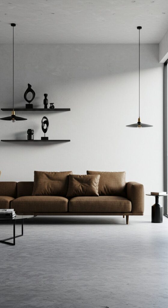 In minimalist spaces, a brown couch grounds the room with subtle warmth amid crisp lines and neutral palettes.