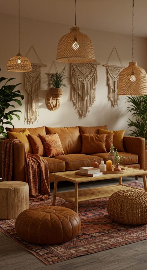 Bohemian vibes wrap around a brown couch with eclectic patterns and global textiles for a relaxed, wanderlust feel.