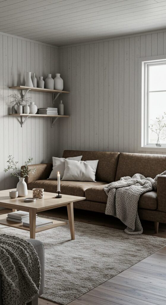 Scandinavian designs embrace a brown couch with light woods and soft textiles for ultimate hygge warmth.