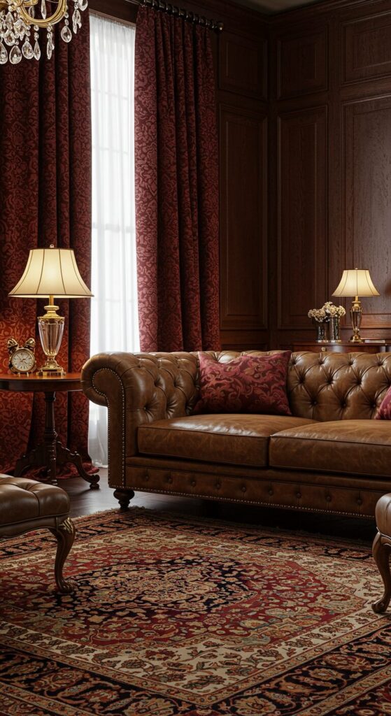 Traditional elegance elevates a brown couch with rich fabrics and antique-inspired details for sophisticated comfort.
