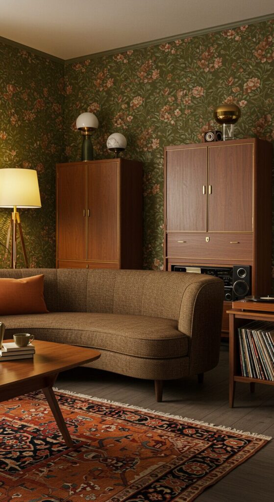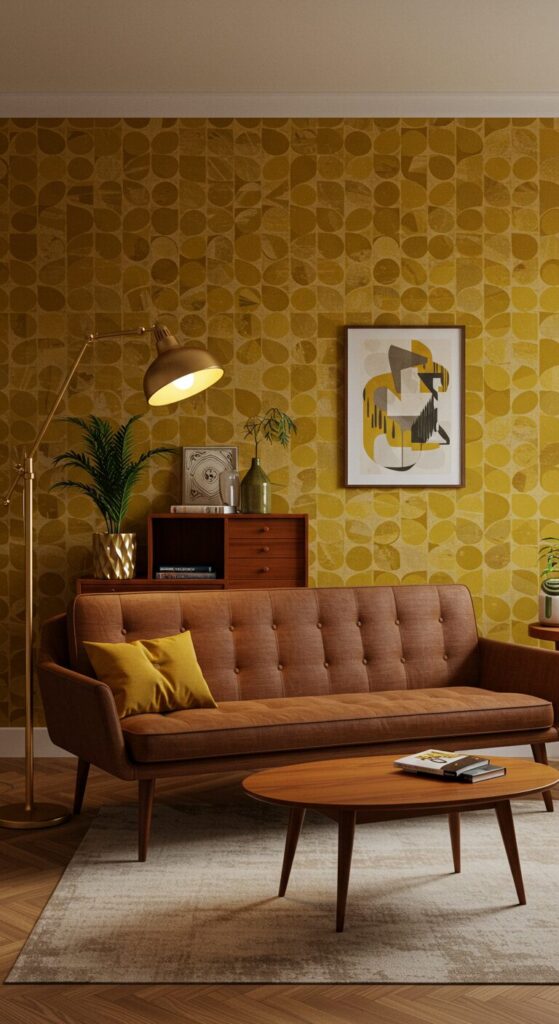 Vintage retro charm revives a brown couch with patterned walls and quirky accents for playful nostalgia.